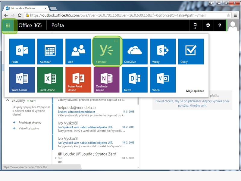 3. V levé horní části stránky zvolte "Seznam služeb Microsoft a vyberte Yammer.